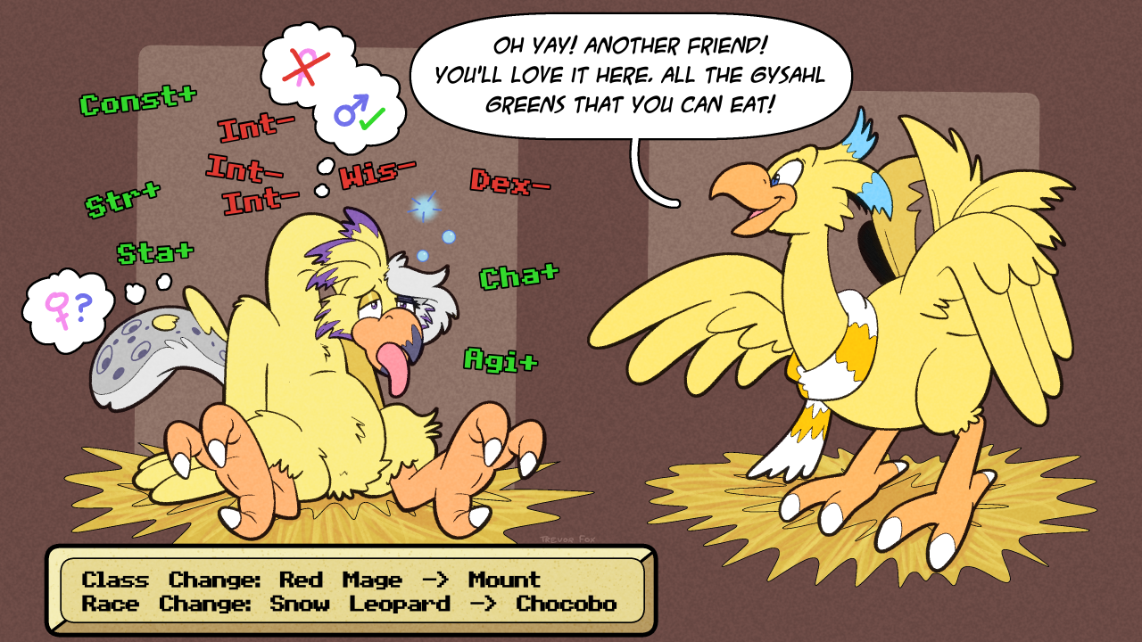 trevor_fox transformation tf transfur trevor-fox chocobo erakir_(character) dialogue speech_bubble Feathers feathered_wings yellow_body ftm_transformation mid_transformation mental_transformation mental_shift orange_beak orange_talons talons claws toe_claws mmr monthly_moogle_raffle gameplay_mechanics