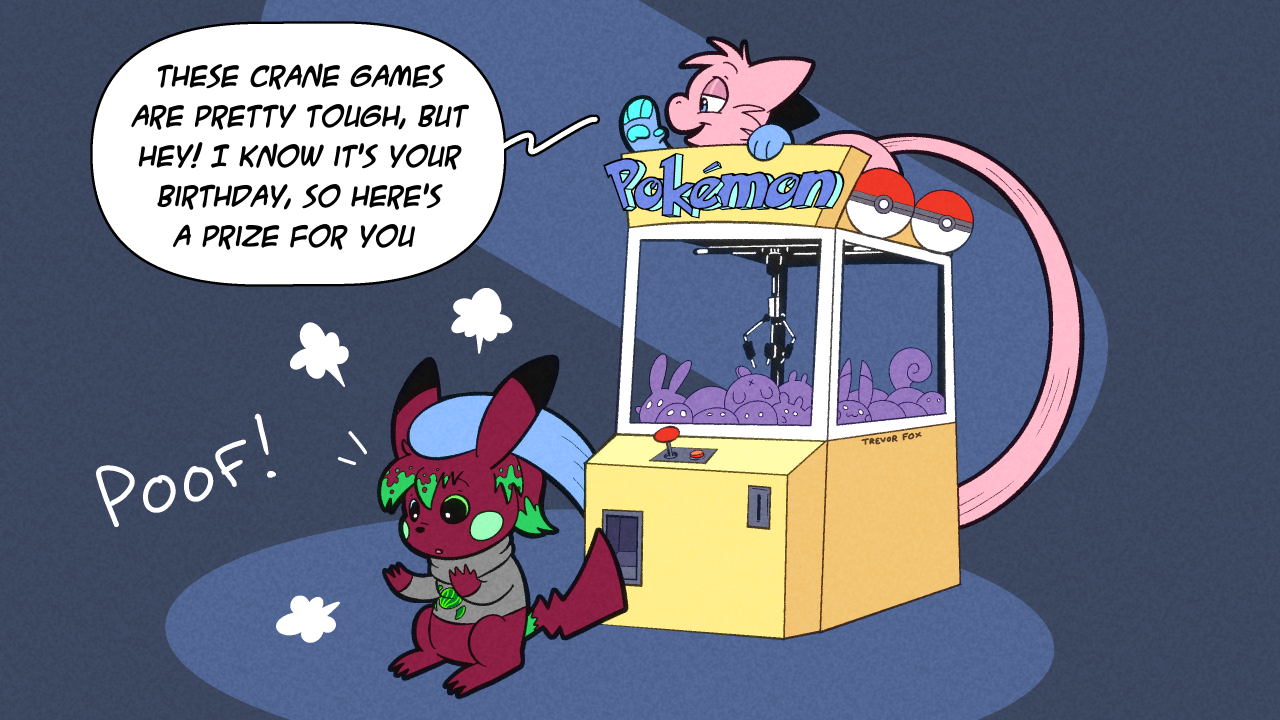 trevor_fox transformation tf transfur trevor-fox after_transformation implied_transformation poof_transformation dialogue speech_bubble poof_effect pikachu pokémon_(species) magical_transformation claw_machine red_fur multicolored_fur pink_fur blue_fur green_fur cheek_spots mew_(pokemon) Mew Pokemon