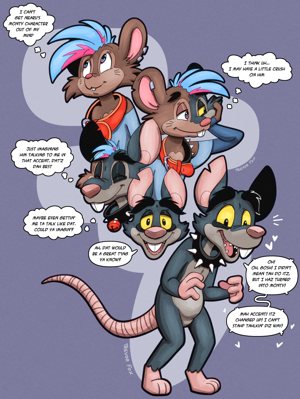 trevor_fox transformation tf transfur rat rodent mouse whisker_markings brown_fur grey_fur buckteeth pink_nose ear_ring ear_piercing jewelry speech_change speech_bubble dialogue thought_bubble thick_eyebrows spiked_collar bell_collar red_collar black_collar pink_tail Sharp_Teeth eye_bags yellow_sclera trevor_fox_(character) rat_tail