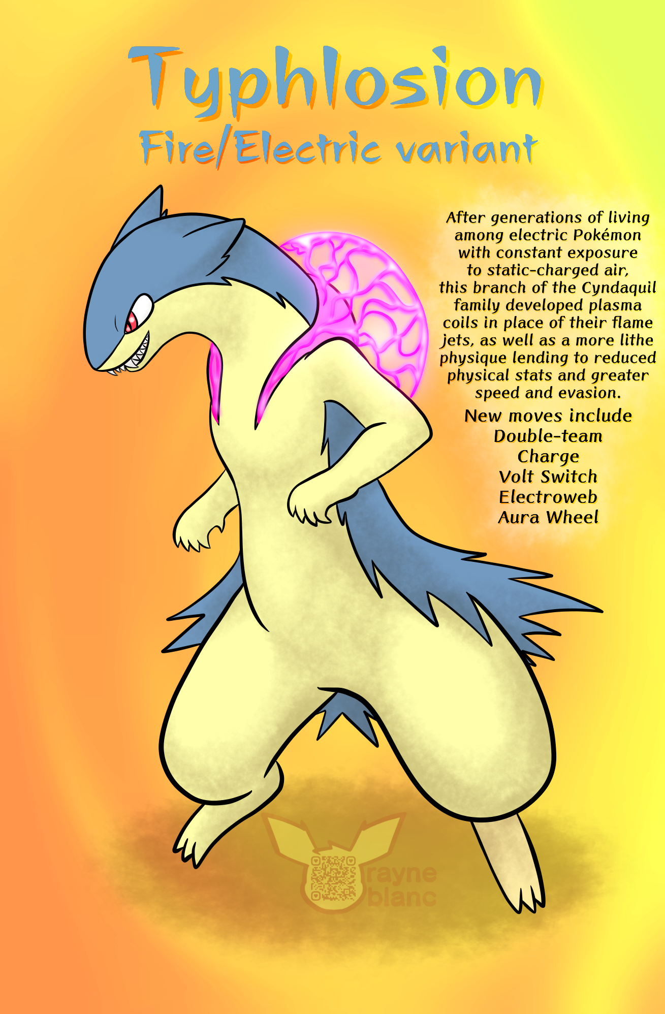Got the itch to do alternate type regional variants of Pokémon last April, but only managed this one before I got too busy: a fire/electric-type Typhlosion with plasma coils in place of the flame jets. I love how it turned out~