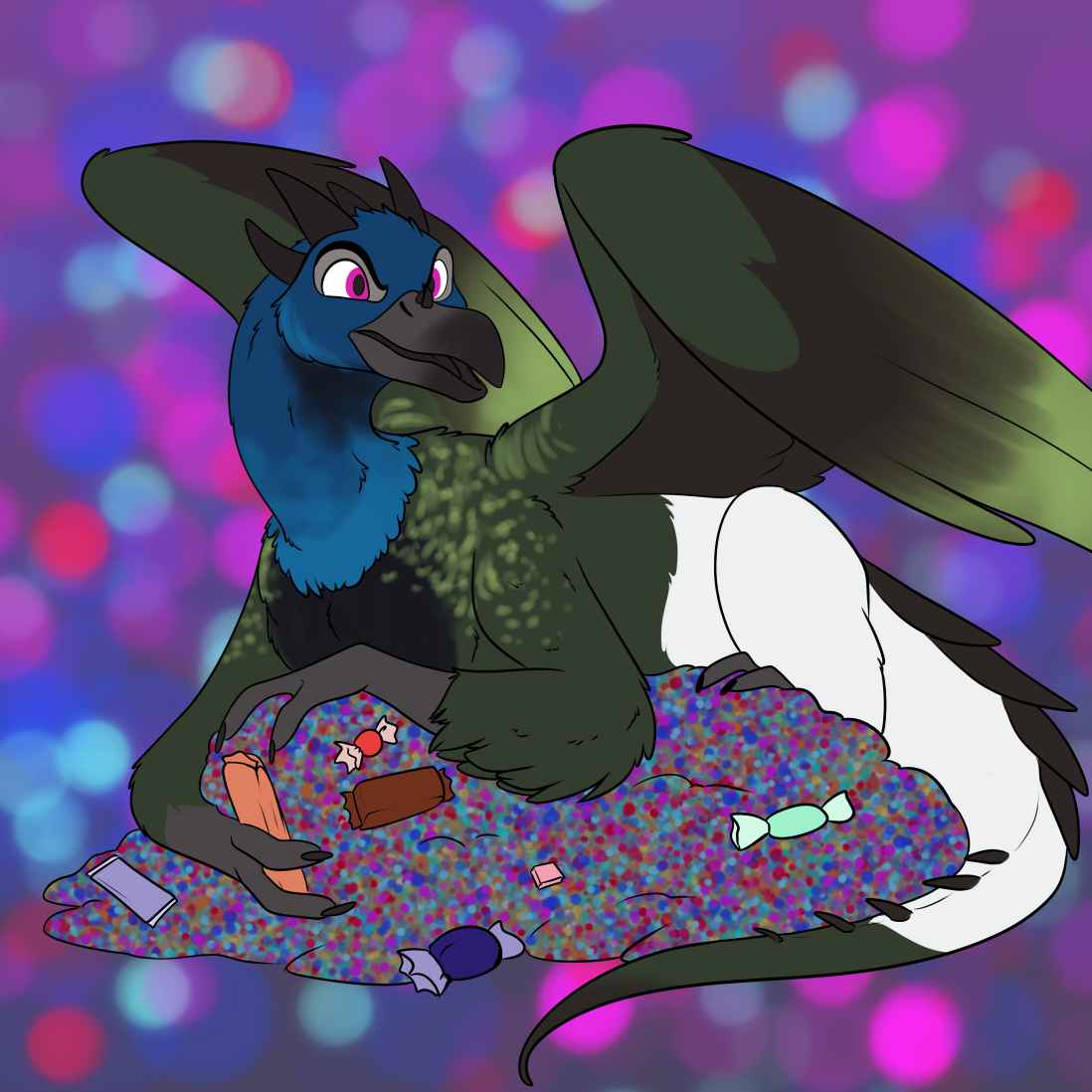 My bird-dragon gathered a hoard of left-over Halloween candy! Maybe if you're nice they'll let you have a piece or two? Perhaps in exchange for some platonic feather-preening or scale-polishing...