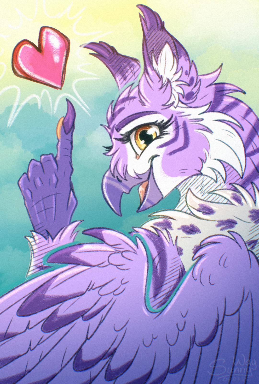 A single smile says it all - and a finger just helps drive the point home! This joyful gryph gal beams with pastel pride and a heart too big to miss. Sometimes, a little kindness and a wink are all it takes 💫 Art Fight attack to Nazfx!