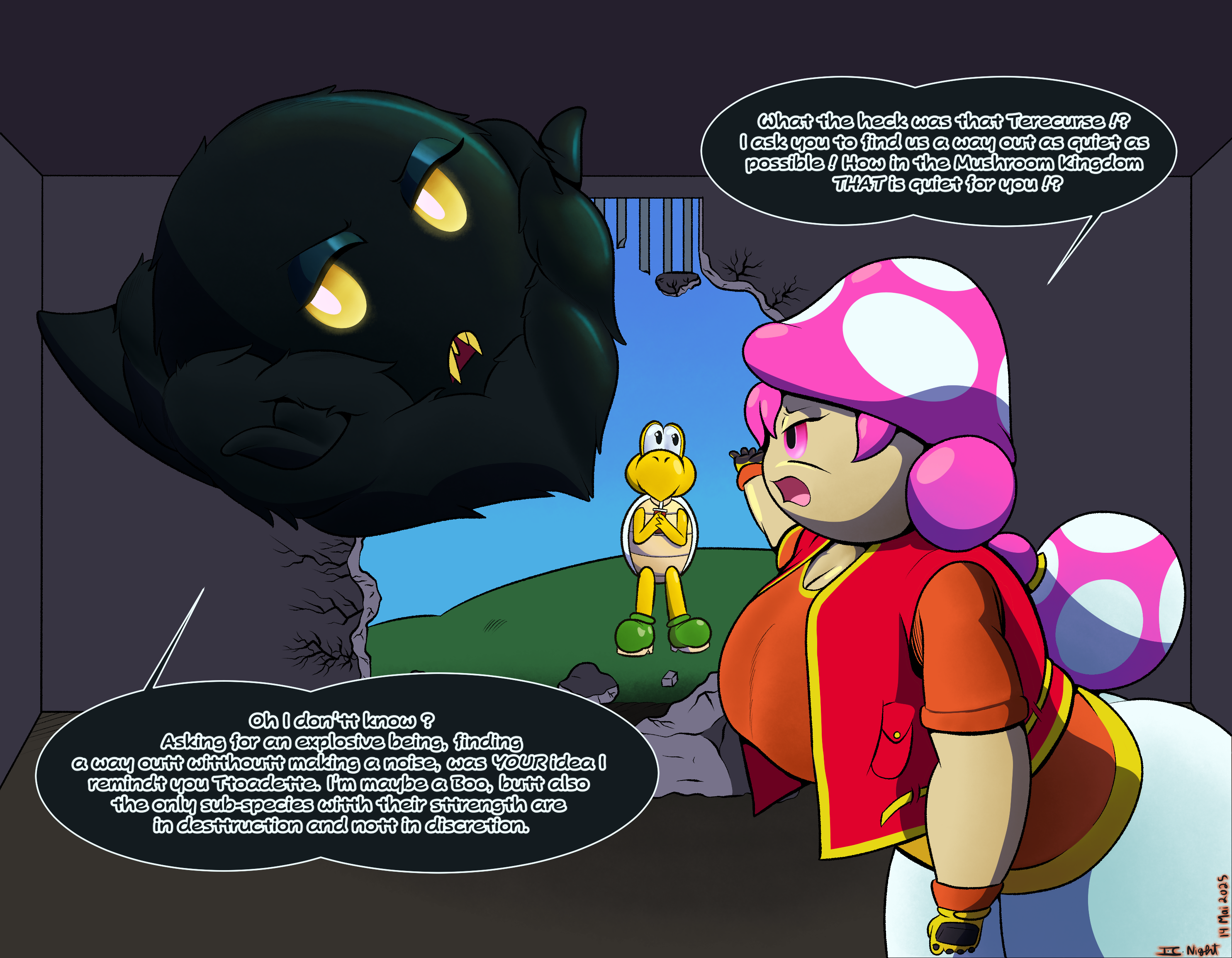 This was a Season 3 MAYbe it's Toadette project. I think this one was a warmup to get my hands on Toadette. And I feel it was funny to add an interaction with one of their allies which ine this one is Terecurse the 'fluffy' Bomb-boo. And yes She has an accent which the "t" sound are emphasized.