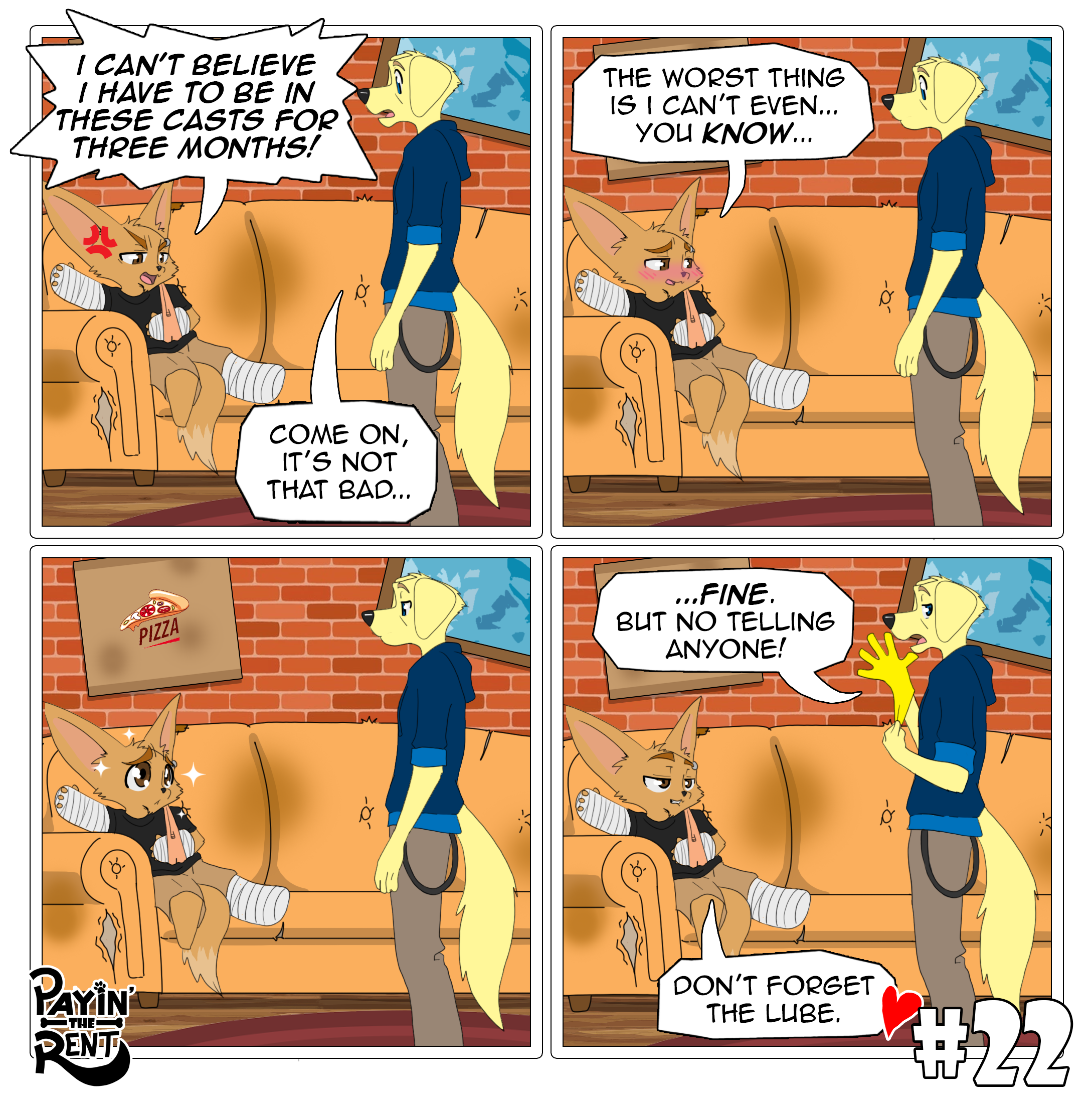 Payin’ the Rent is a slice-of-life comedy comic following the chaotic misadventures of Roger, a foul-mouthed, laid-back fennec fox, and Ben, his nerdy, optimistic Labrador roommate. The two live together in a cramped apartment where every day spirals into ridiculous situations.