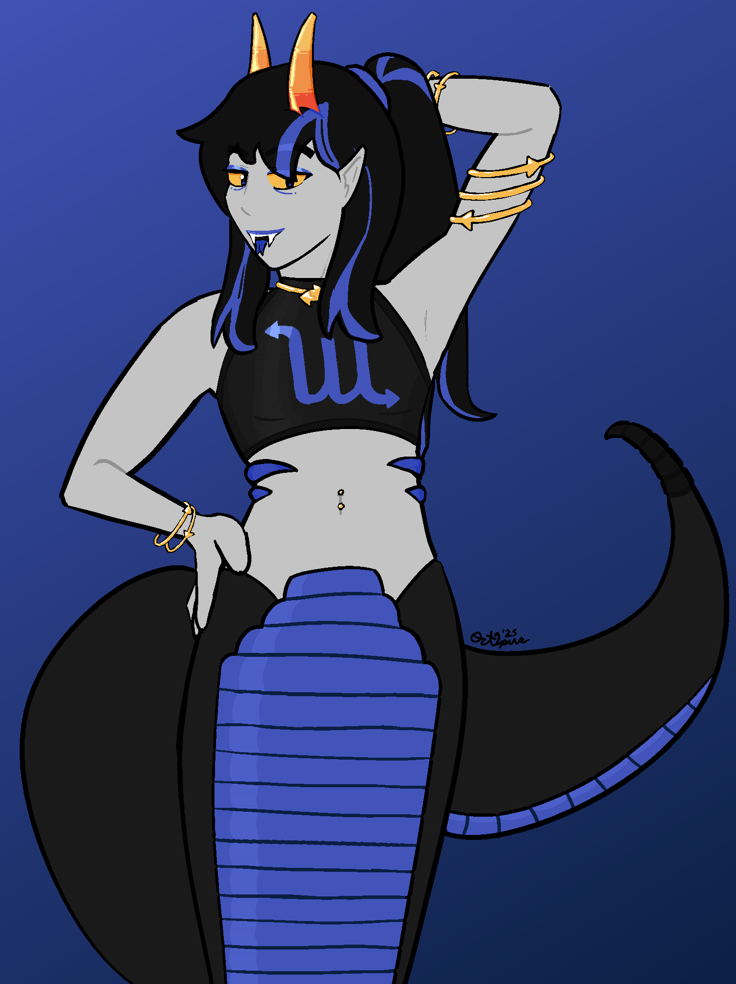 The top was originallly more sports bra-y, with some wrapping text but it looked a bit goofy to me. I included gold because that's what snakes wear, gold. When drawing Momboa Pastel (my cerulean with snake influences) i tended to use arrow imagery a lot, so I leaned into it (but i did always have it be arrows facing AWAY from each other). I think the sign on the base troll is literally just vriska's upside down, so I modified it further into a fuller sign.