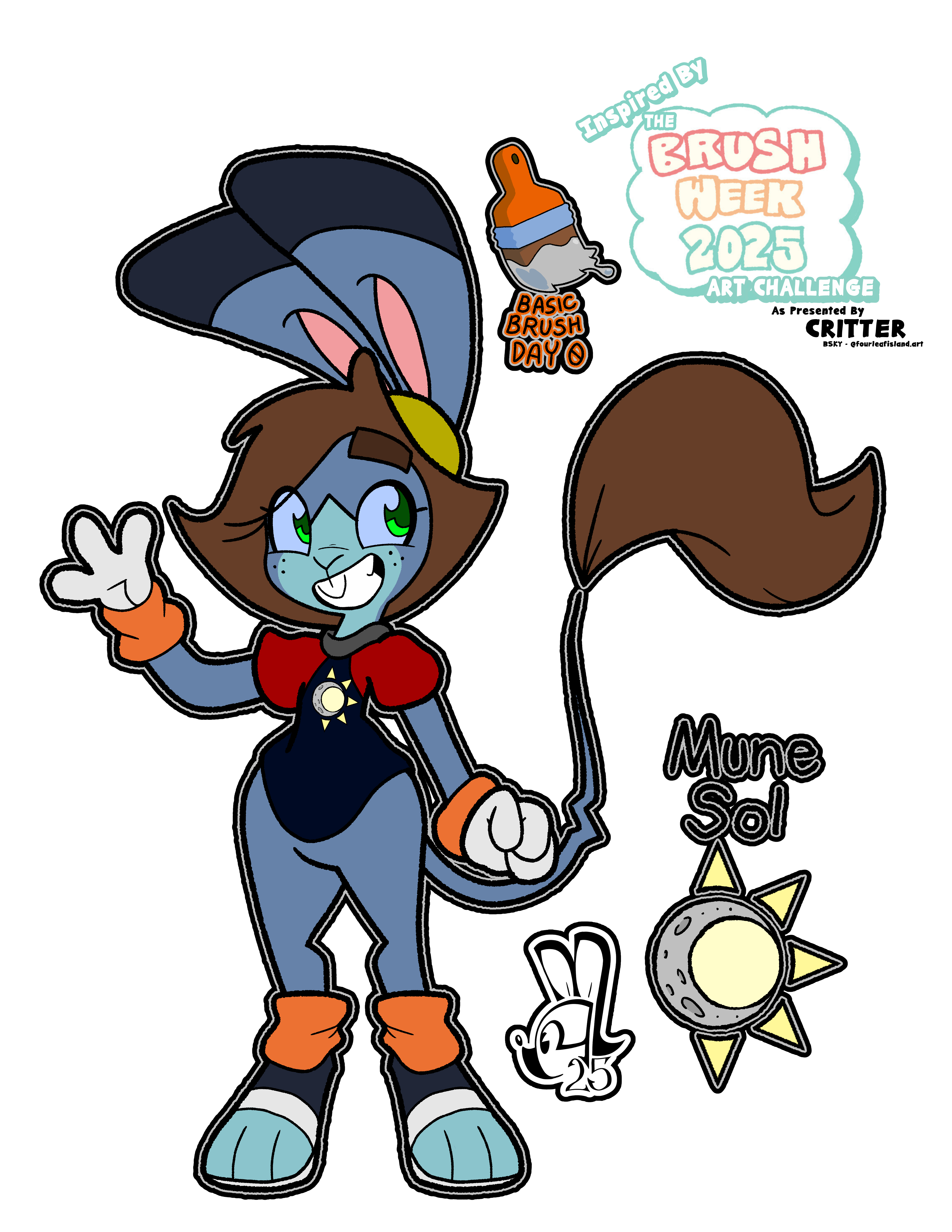 Hey all! I really wanted to take part in #brushweek2025 put forth by Critter on Bluesky! Unfortunately, my hands were hurt (and still are) but I'm taking part anyways, even if it's a bit late. In order to do so, I decided to bring Muniversal back to their roots for the contest. So for Brushweek Day 0, say hello to Mune Sol!