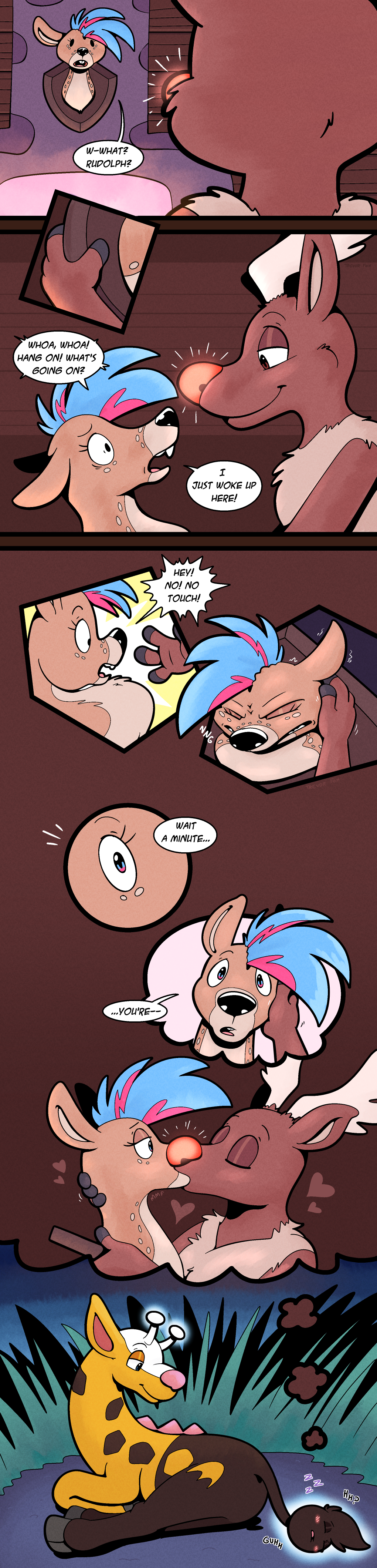 trevor_fox transformation tf transfur trevor_fox_(character) girafarig kyp_(character) deer_head deer reindeer rudolph_the_red-nosed_reindeer antlers psychic_powers dream_manipulation yellow_fur brown_fur blue_eyes brown_eyes speech_bubble dialogue comic text blush sleeping kissing red_nose black_nose pink_nose glowing_nose rudolph