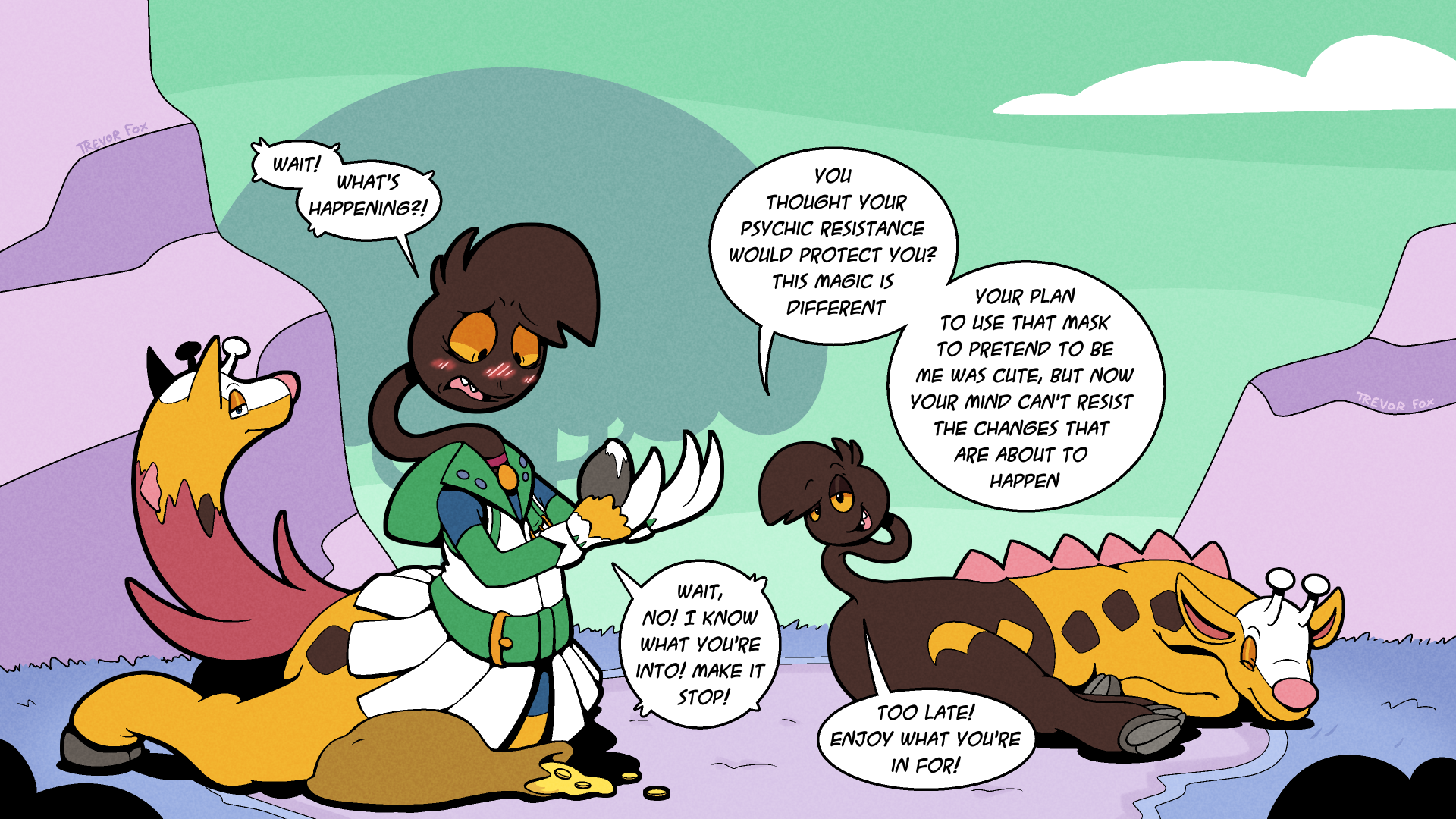 trevor_fox transformation tf transfur girafarig pokémon_(species) Pokemon kyp_(character) speech_bubble dialogue blush blush_lines blushing_profusely mid_transformation magical_transformation twinning hooves cloven_hooves yellow_fur brown_fur orange_sclera blue_eyes pink_nose Sharp_Teeth trevor_fox_(character) upside_down_transformation udtf