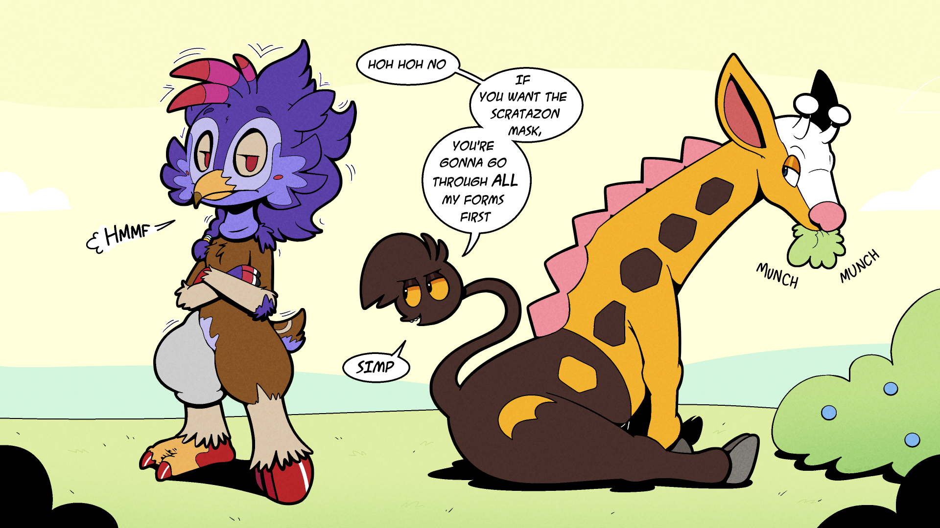 trevor_fox transformation tf transfur twinning rito deer girafarig pokémon_(species) tail_head living_tail Sharp_Teeth eating speech_bubble dialogue cloven_hooves yellow_fur brown_fur spotted_fur spikes_(anatomy) pink_nose orange_beak purple_feathers mask_transformation wearing_mask mask trevor-fox_(character) orange_sclera blue_eyes red_eyes red_hooves talons toe_claws duo trevor_fox_(character) Pokemon