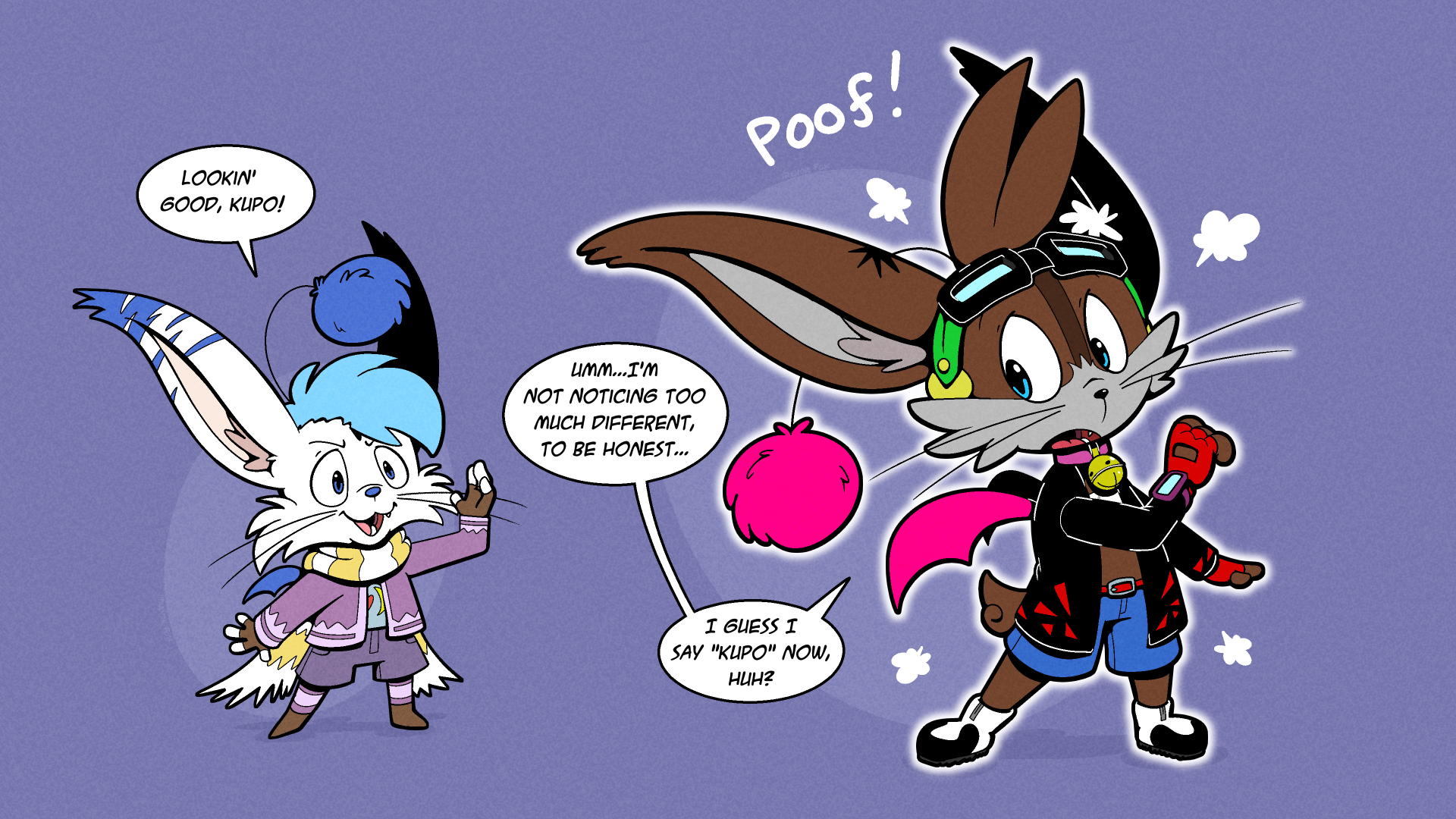 trevor_fox transformation tf transfur ivalician_moogle pom_antennae erakir_(character) dialogue speech_bubble whiskers white_fur striped_fur bat_wings blue_nose jacket fingerless_gloves shorts blue_hair after_transformation implied_transformation poof_transformation text duo sound_effects brown_fur shoes Boots red_gloves male Female