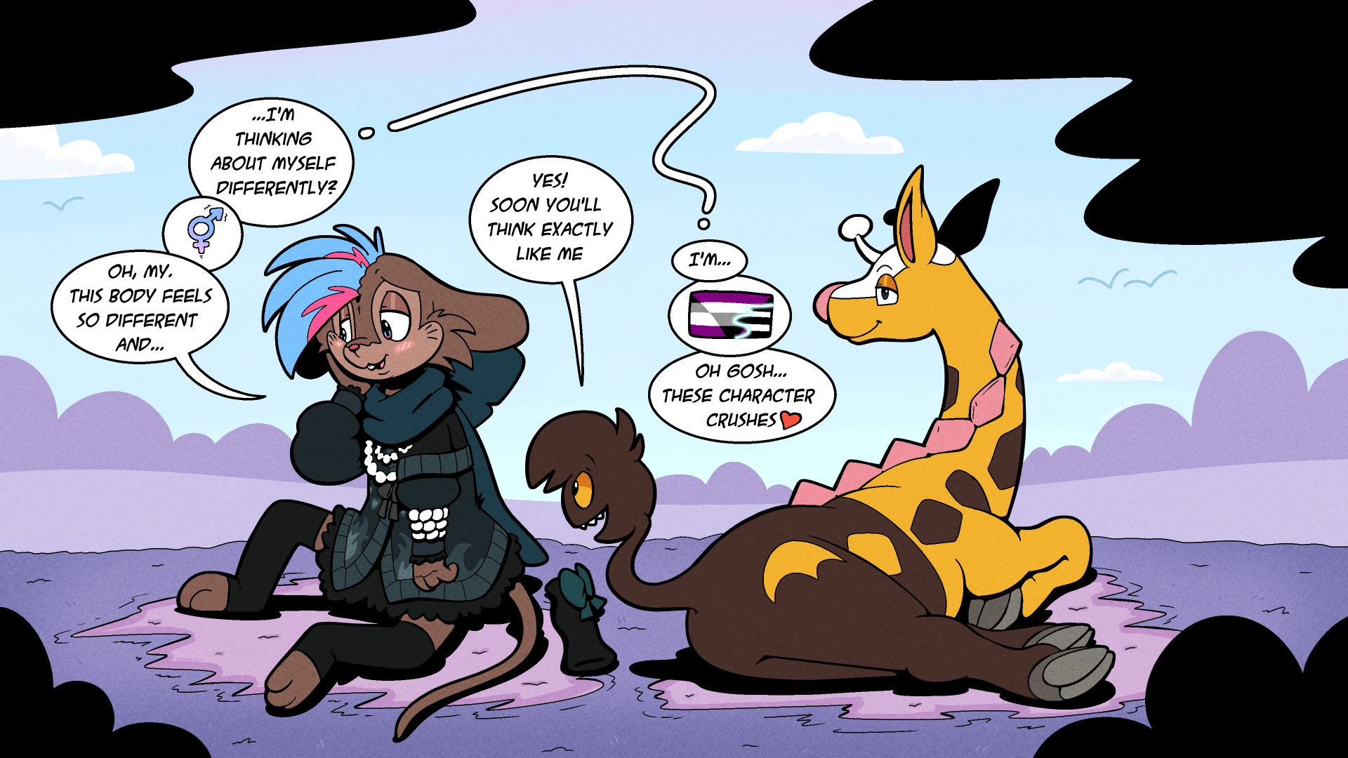 trevor_fox transformation tf transfur trevor_fox_(character) kyp_(character) yellow_fur brown_fur orange_sclera blue_eyes after_transformation implied_transformation Orientation_Play identity_change twinning mouse rodent whisker_markings red_nose pink_nose spikes_(anatomy) girafarig cloven_hooves antlers speech_bubble dialogue blush buckteeth Pokemon nonbinary