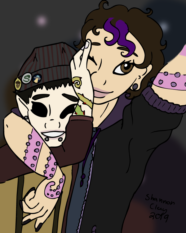 There's an #IAmNonbinary event going on on twitter today, so I figured it was a good time to give these utter dorks a new piece of art. Kit, left, is my C:tL darkling from a game a few years ago and uses it/itself pronouns; Kip, right, is its fetch and as last I was aware was using squid/squidself pronouns. They're the worst at the changeling/fetch relationship, as can probably be inferred from the fact that this is a dumb selfie.