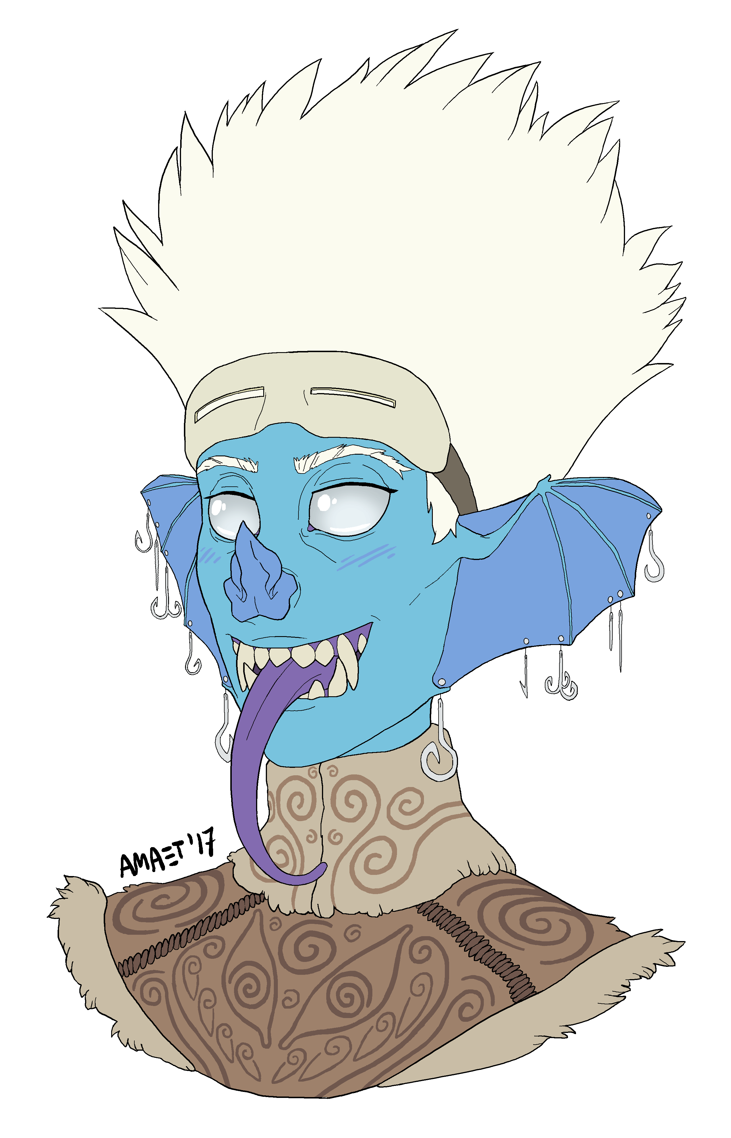 Solidifying the bat motif redesign for the Derro. I decided long tongues would also be a feature as its just really cool. Beyond her inclination for self-destructive earrings (which certainly painfully backfire but this she intends). This piece also shows another gimmick of Derro culture I touched on earlier. Spirals!
