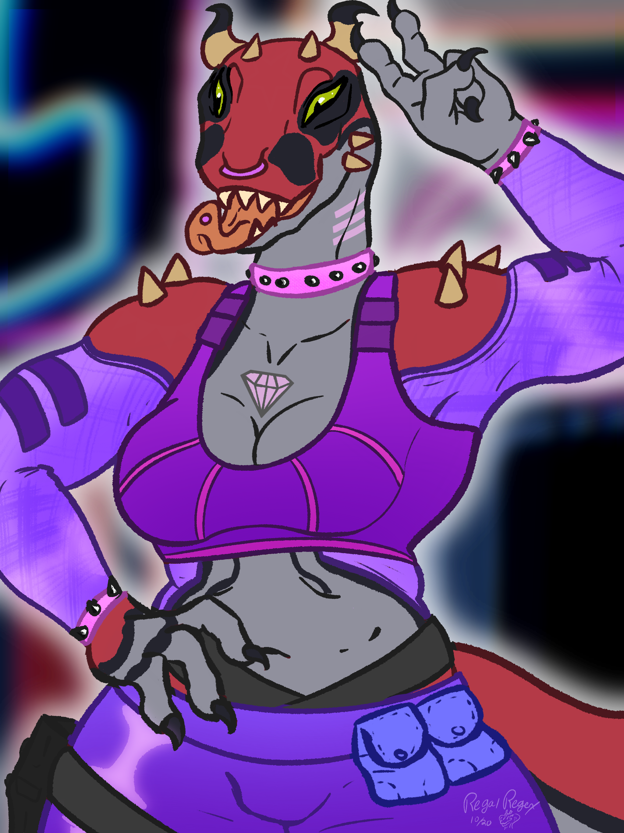 First full art of a Dino adopt I got! Her name is Dahlia, and she enjoys neon fashion π π Β Some other sites you can find me at π Twitter: RegalRegex | FA: RegalRegex | Tumblr: RegalRegex