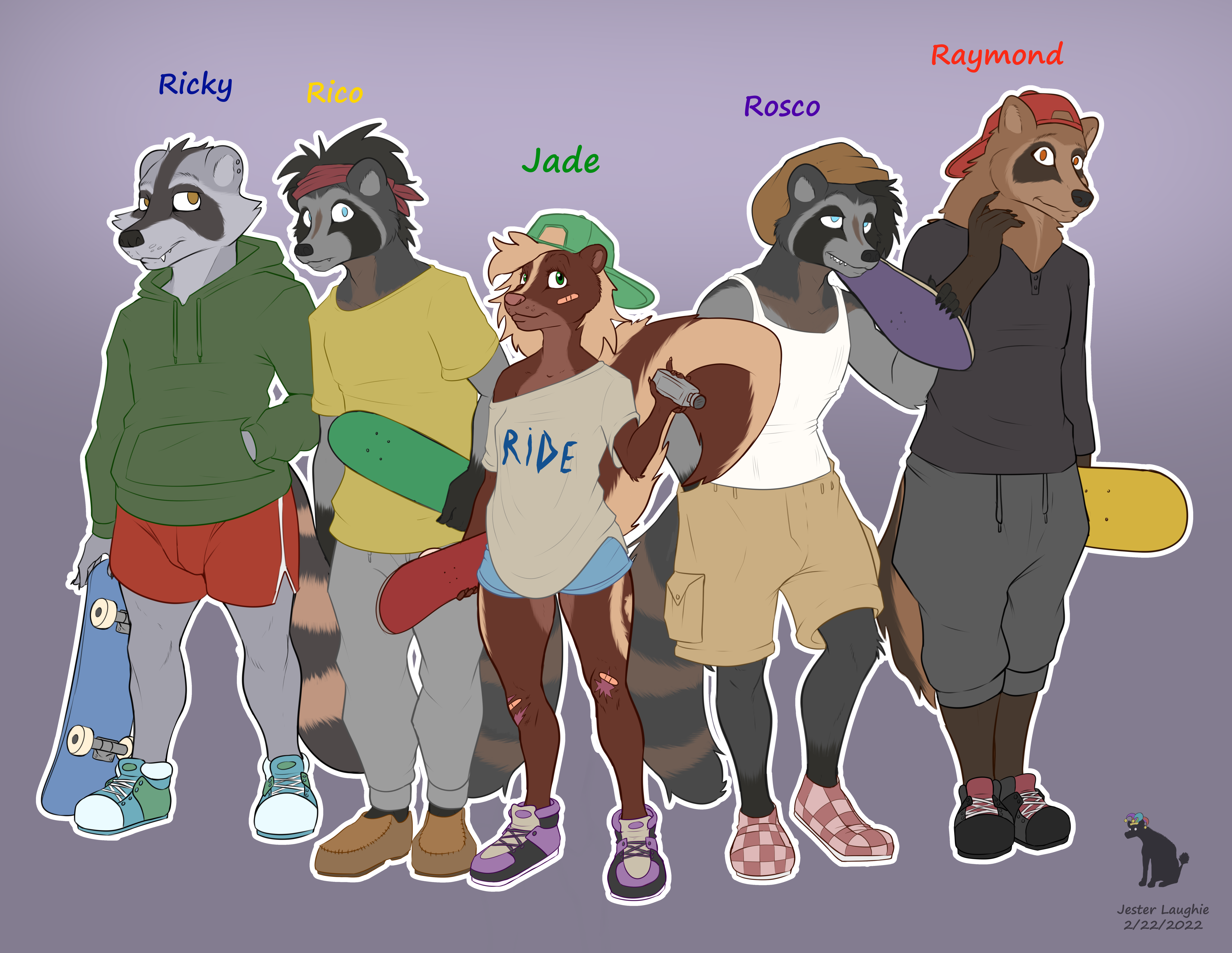 I've had an idea for a skunk character named Jade in the back of my mind for a while. Jade used to be a chubby intersex skunk with black and white fur and a shy personality. I've entirely scrapped her old design and created a new character that fits into the world I've created for Hibiscus. I've broken out of my shell a little bit and decided to make her more petite which is a break from my normal very thick female bodies, couple that, a female character with a normal vagina for once, as well as four new male characters to boot. Jade is friends with Hibiscus, she's a skater and she spends time with a group of four guy friends. Three raccoons and one raccoon dog who is desperate to fit into the group. Jade and Hibiscus went to the same school and are both 19 years old. I'm still working out intimate details on her characters backstory and personality but I'll share what I have so far. Jade and her friends are all skaters. She doesn't have a job and mostly gets support from friends and family. She loves skating, photography, and creating films and plays, you'll be hard pressed to find her without her camera or video recorder. Jade has a odd estranged history with her father (yet to be fleshed out, but he's out of the picture) which has left her with a thing for dads, and a sexual fixation with men. She was raised mostly by her mother. She's a tomboy, outgoing, and not very good at skating and rarely lands tricks successfully, as a result she's got many scars on her knees and elbows. But she still sees skating as her passion and is eager to impress and keep up with her male friends. She has a very close and intimate relationship with all four of her friends. Two of which are biological brothers, near twins. The other is a shorter stockier raccoon. The last, a raccoon dog who has been outcast by most other dog friend groups. The four share and support Jade, each of them care for her very much and the group remains the best of friends. Apart from skating they share a lot of the same interests as Hibiscus, loving comic books, and retro video games. Hibiscus and her friend group often find themselves intermingling with members of Jades group. The stories for the male characters will emerge as I create them in the next day or so. I have plans to make many spicy group scenes with the five of them. Also she loves easy cheese.