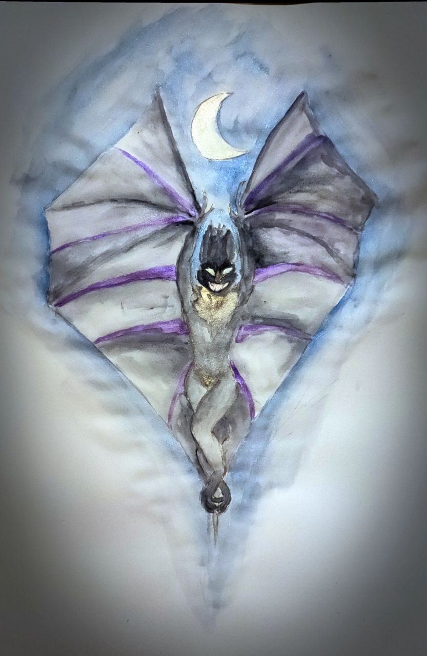 A3 paper, water colours, most of them some effect colour, except black. black is just flat black. Alt where not supported (by Postybirb): watercolour painting of a bat anthro with wings outstretched upwards, framing a crescent moon.I can be found on loads of other places: just look here