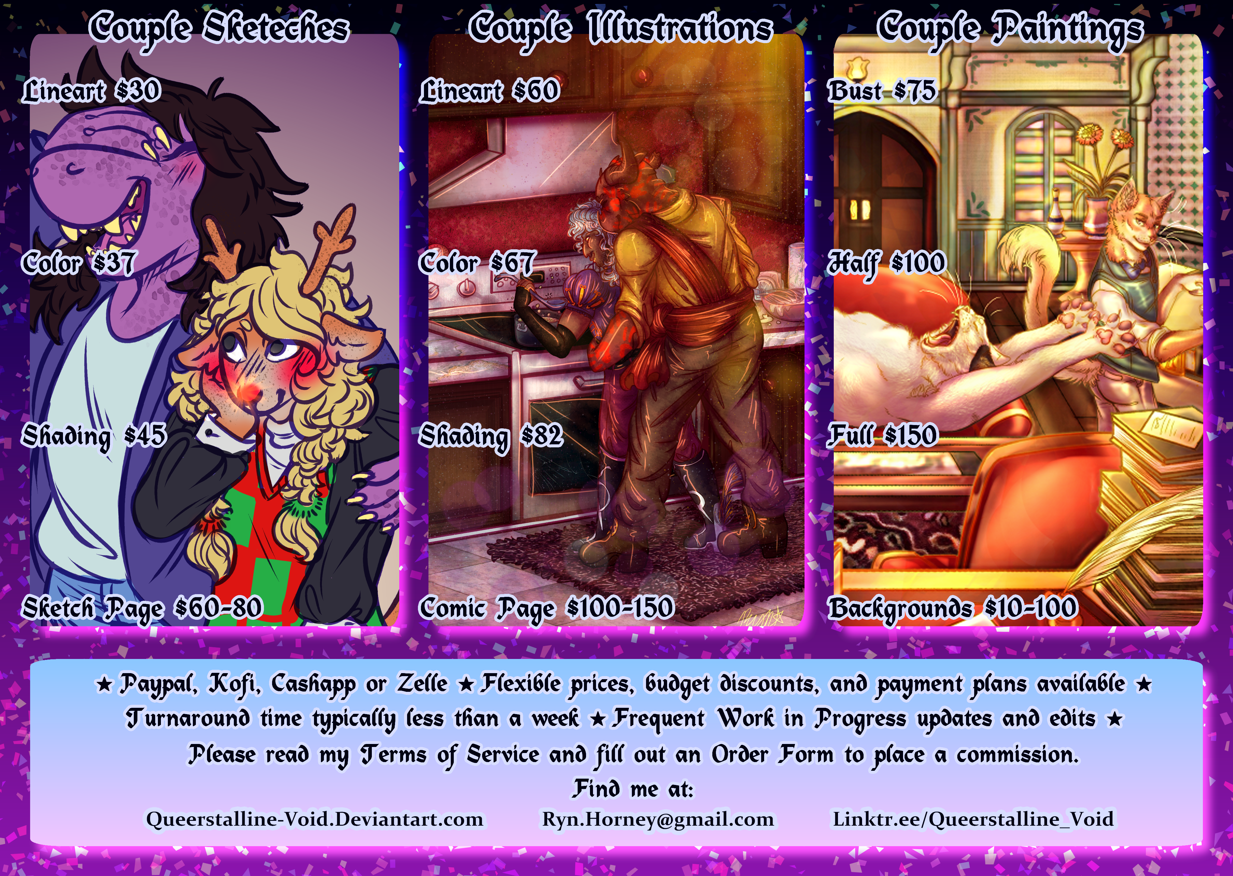 Meowdy Nya’ll! I'm Ryn, They/Them, and I am saving money for my upcoming top surgery and wedding! I'm very interested in creating art for you. Here are my Prices and Examples, and please feel free to check out my Gallery if you'd like to see more! The best way for me to give you an exact price is if you'd fill out my Order Form! Please check it out, as it includes my Terms of Service. Note this is the price for ANY two characters, not just ones in romantic relationships. I can also do friends, family, enemies, and fight scenes! Message me any time!
